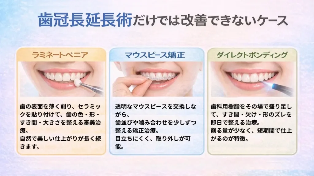 まず、歯冠長延長術で歯ぐきの位置と歯の長さを整えます。そのうえで、ラミネートベニアを併用すると、歯の形・色・大きさまで細かく調整できます。
