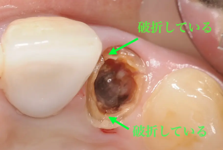 画像の歯のように、神経の治療を繰り返し歯質が少なくなると、噛む力に耐える強度が低下し、歯根は割れやすい状態になります。