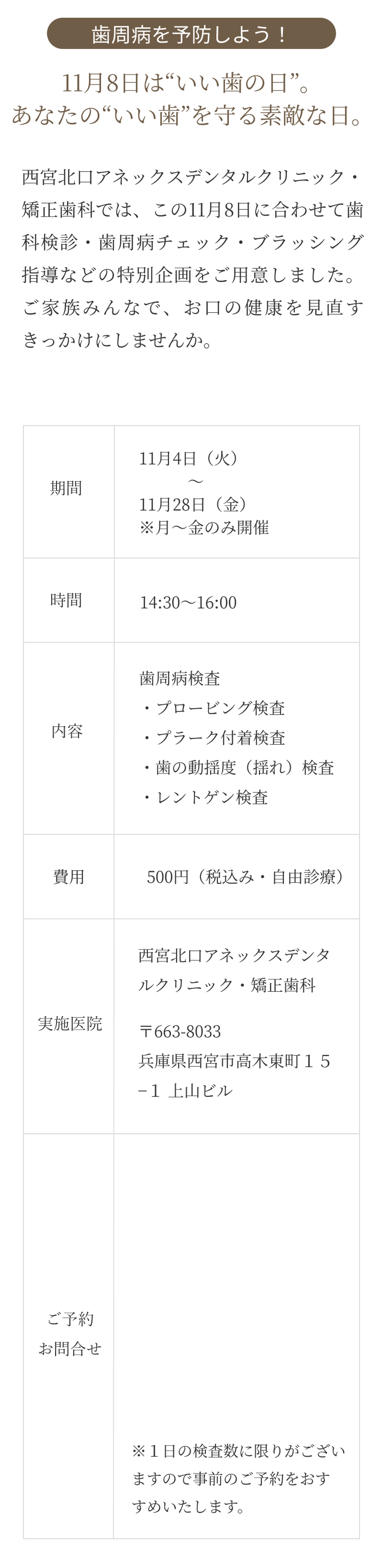西宮北口アネックスデンタルクリニック・矯正歯科では、この11月8日に合わせて歯科検診・歯周病チェック・ブラッシング指導などの特別企画をご用意しました。ご家族みんなで、お口の健康を見直すきっかけにしませんか。